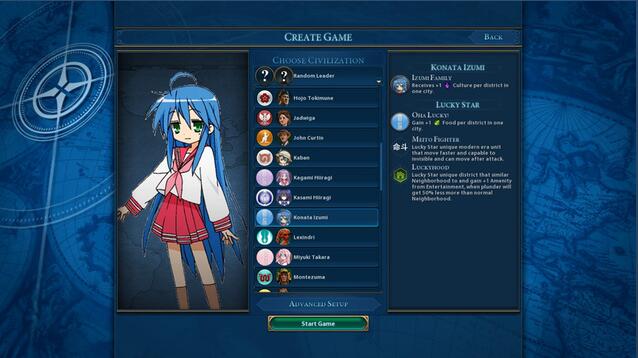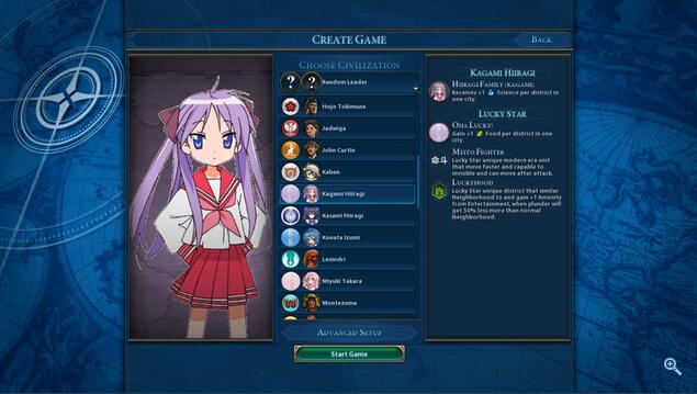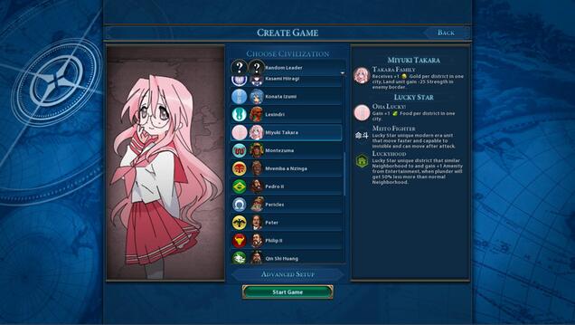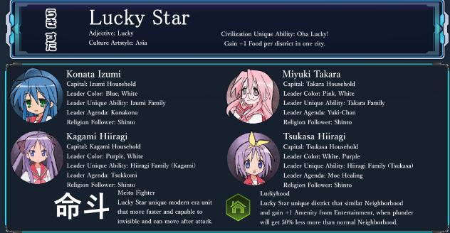 这是文明6v1.0.0.167泉此方幸运星文明mod,拥有泉此方,柊镜,柊司,高良美幸四位领导人的幸运星文明mod,啊臣民都是死宅吗,喜欢的朋友赶紧下载吧!
