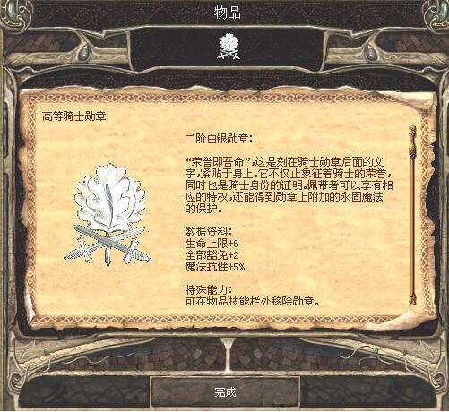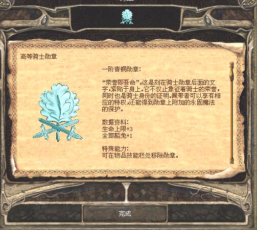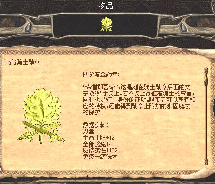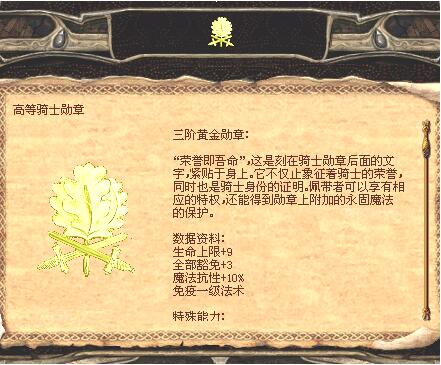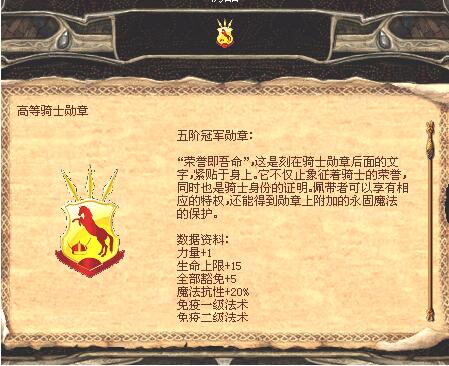 ·荣誉:“荣誉即吾命”,这是刻在骑士勋章上面的文字。大骑士长可随时将自己的骑士勋章召唤出来,悬挂在自己脖子上,持续8个小时。但必须注意,它会替代掉原来的项链,必须先将其它项链拿掉。(勋章效果:1/6/11/16/21级勋章效果不同,分别增加少量生命上限、豁免、魔抗。11级起免疫一级法术,21级时免疫一级与二级法术,免疫封魔。)