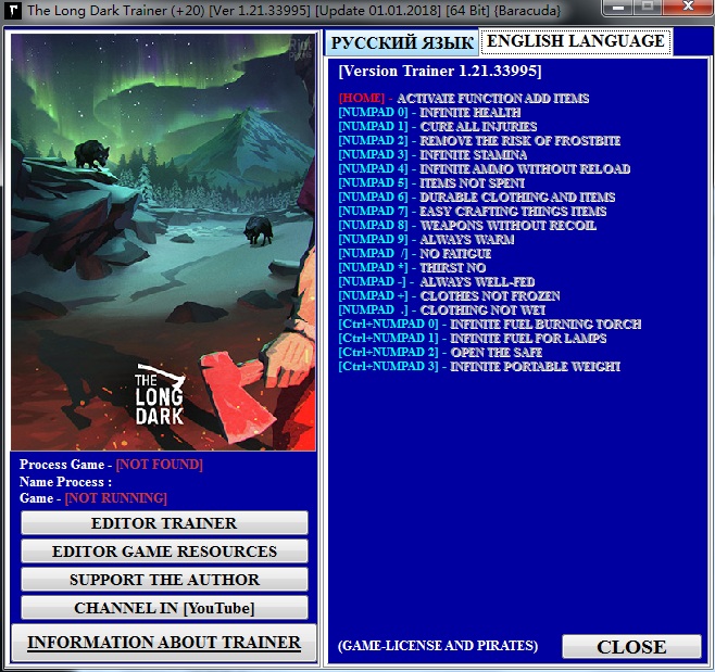 这是漫漫长夜v1.21二十一项修改器,Baracuda制作,具有无限生命,不会扭伤和烧伤,去除风险冻伤,无限耐力,无需重装弹药等二十一项实用探险生存修改功能!