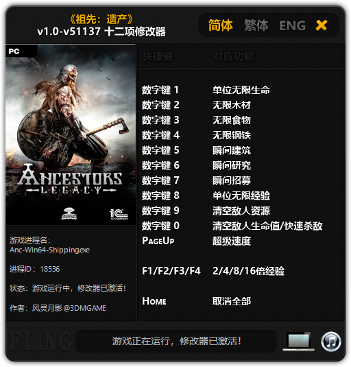 这是祖先遗产v1.0-v51137十二项修改器风灵月影版,具备单位无限生命,无限木材,无限食物,无限钢铁,瞬间建筑,瞬间研究,瞬间招募,单位无限经验十二项修改功能,让你轻松击败你的敌人,保卫祖先遗产!