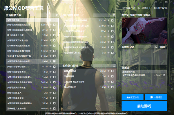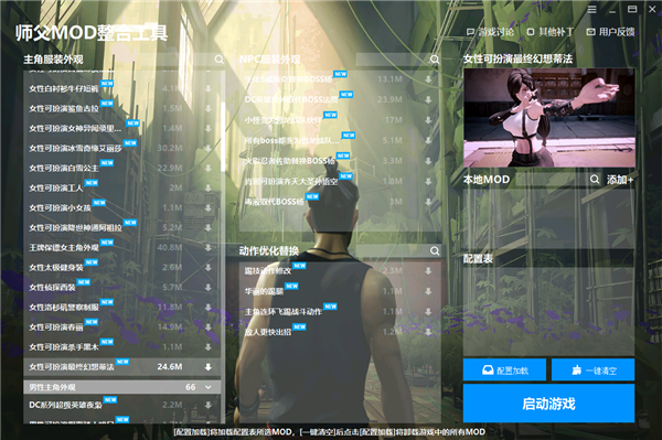 师傅MOD整合工具作为游戏师傅的玩家自制模组,在游戏中朋友们可以利用模组,将游戏中的各种配置进行优化,提升游玩的速度体验,可以自己预设游戏中的场景资源,整合了众多模组可以自由选择使用自己需要的模组工具添加到本地。