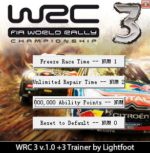 《FIA世界汽车拉力锦标赛3》修改器补丁,这是一个拥有冻结比赛时间、无限维修时间以及增加1000000能力点属性修改器共3项功能的修改器,适用于《世界汽车拉力锦标赛3》破解汉化版。